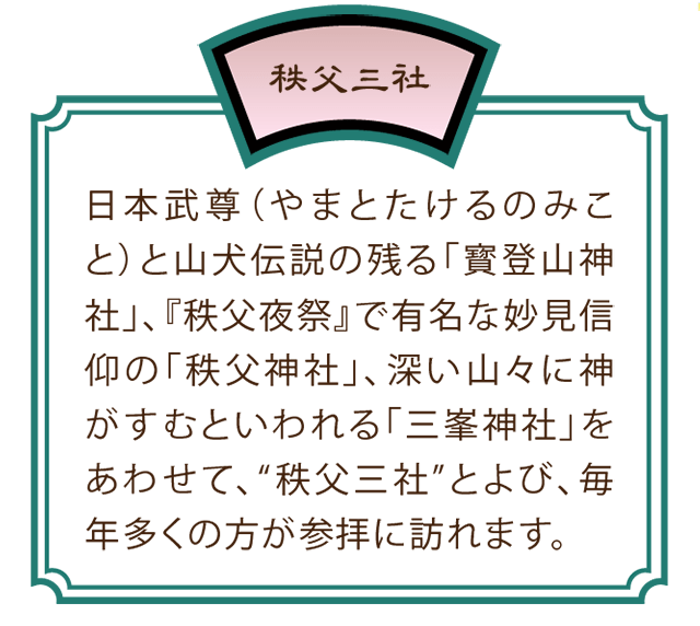 秩父三社(寳登山神社、秩父神社、三峯神社)、 秩父札所 13 番 (慈眼寺)、秩父札所 15 番(少林禅寺)、 秩父札所 16 番(西光寺)